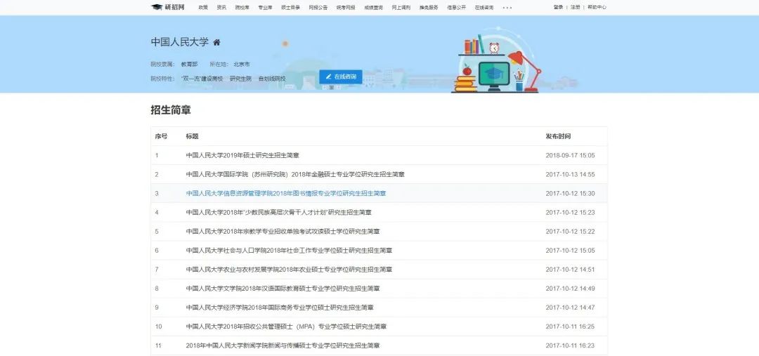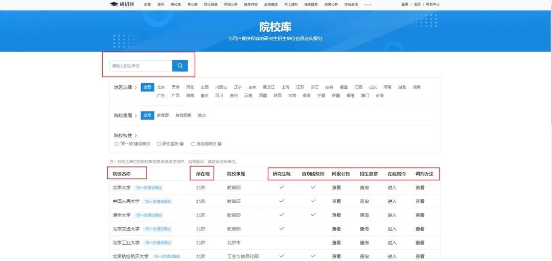 考研er们使用最多的当属 【信息库】和【硕士】两个栏目了,作为考研新生,在【信息库】中你可以发现 「院校库」「专业库」「专业学位」,前两个子栏目中,你可以查询到各个院校所在地、隶属、报考公告等信息。