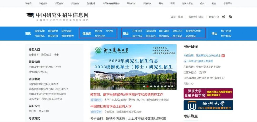 【研招网】是教育部唯一指定的研究生入学考试网上报名和调剂网站,是我们了解考研相关信息、报名、查询成绩的官方网站,大名鼎鼎的研招网全称为“中国研究生招生信息网”,网址: https://yz.chsi.com.cn/