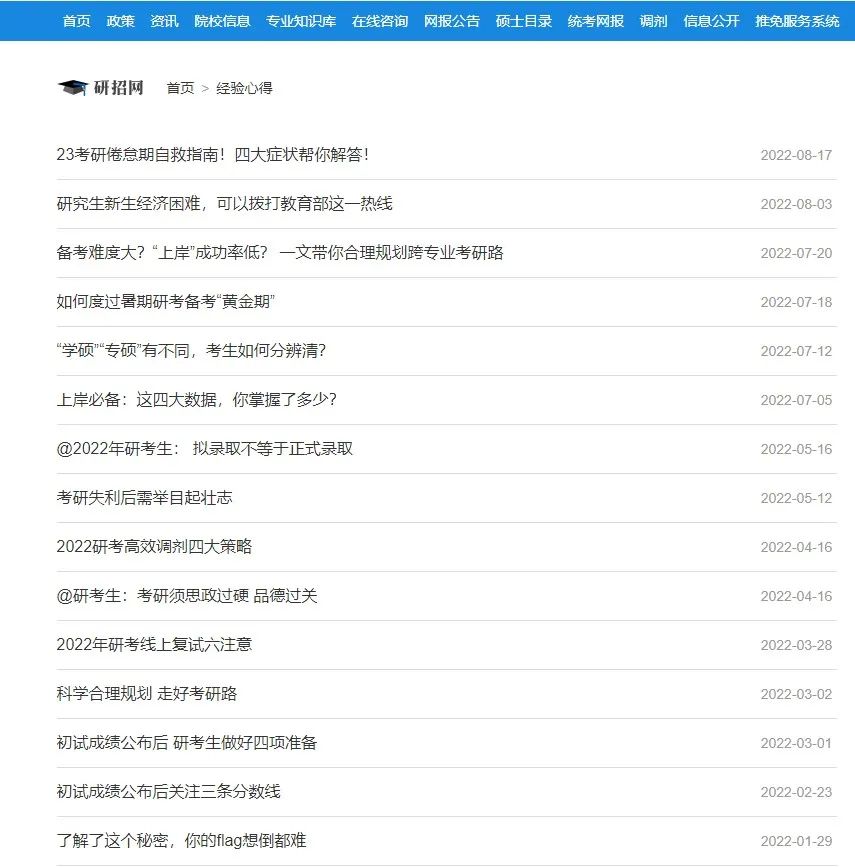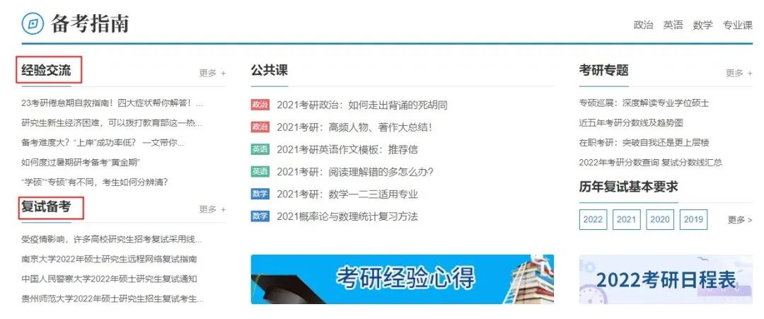 下拉页面,我们可以发现【备考指南】,里面包含了初试和复试的备考经验、时间规划建议等,如下图所示,参考下前人的经验可以让我们的备考少走弯路哦~~~