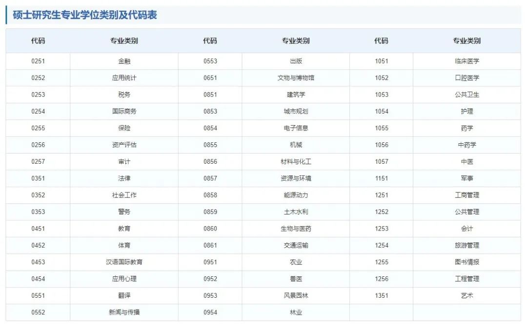 在「专业学位」中,我们可以看到专业学位的类别,咱们翻译硕士专业也在其中。下方可以看到「专业代码」, 此处注意,专业名称类似,但可能属于不同的院系,专业代码也就不同,大家注意区分。