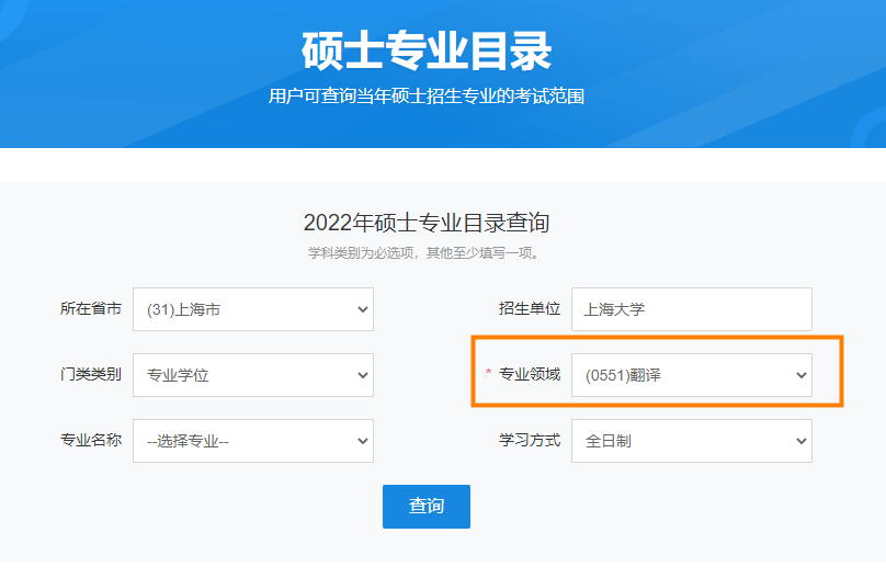 在【硕士】这个栏目中,大家使用频率比较高的是「硕士目录」这个子栏目,如果你有比较明确的意向院校想了解,可以在这里输入具体的招生单位名称,专业领域如“翻译”,想了解的学习方式(全日制or非全日制)等,然后点击查询。